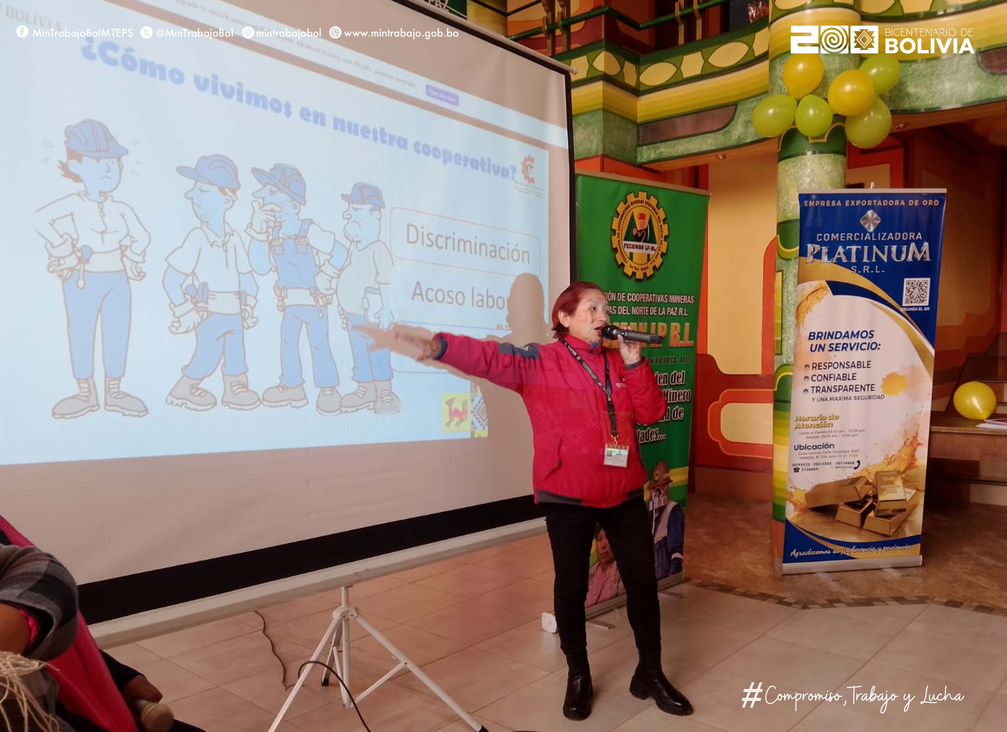 Ministerio de Trabajo, 15 de octubre de 2025.- Con la participación de 35 asociados y asociadas de la cooperativa minera aurífera del norte de La Paz R.L., la Dirección General de Políticas Públicas, Fomento, Protección y Promoción Cooperativa llevó a cabo el curso taller de Educación Cooperativa.