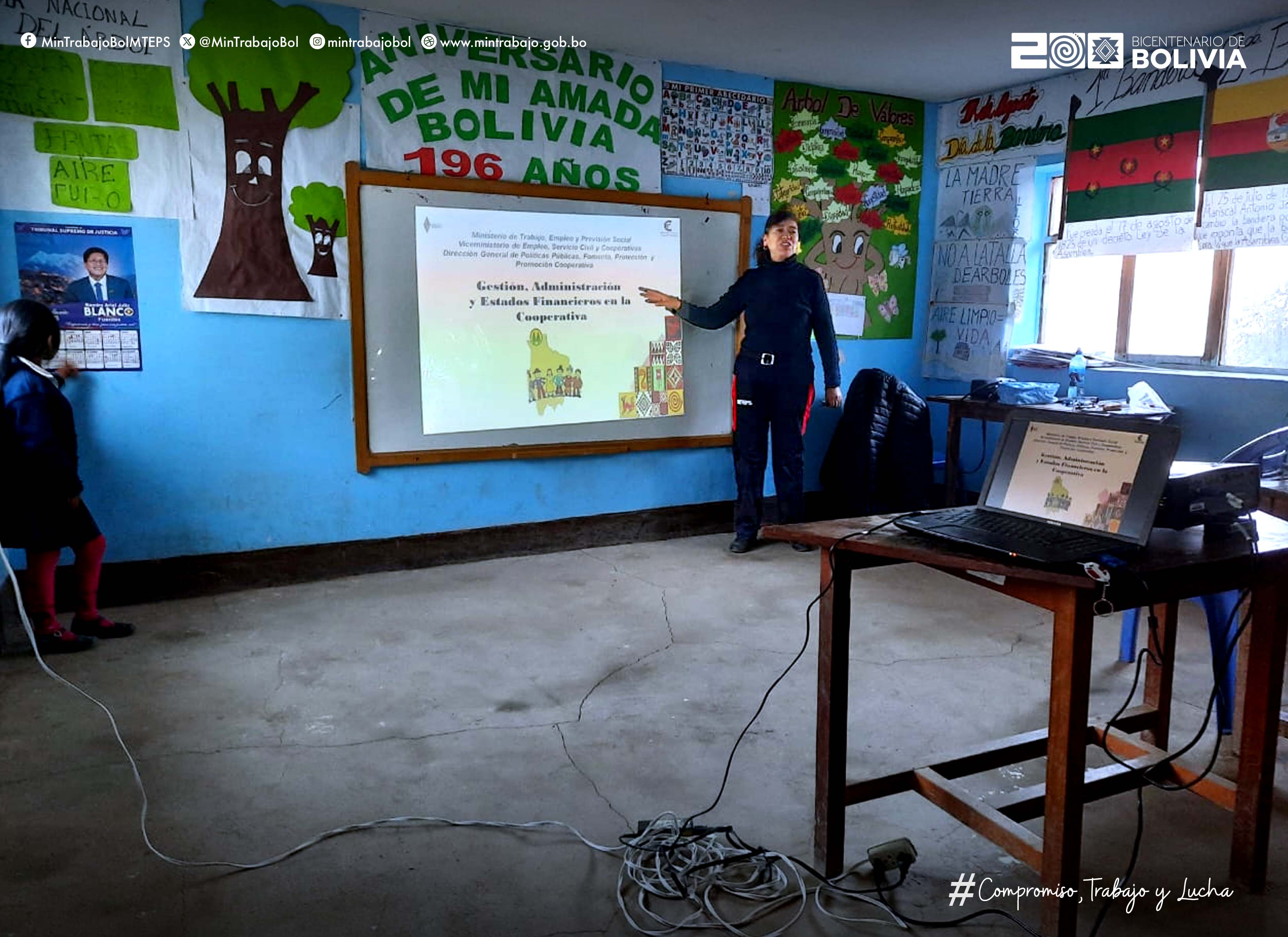 Ministerio de Trabajo.- La Dirección General de Políticas Públicas, Fomento, Protección y Promoción Cooperativa, dependiente del Ministerio de Trabajo, se trasladó hasta la comunidad de Canqui, en el municipio de Inquisivi del departamento de La Paz, para impartir el curso de Educación Cooperativa.