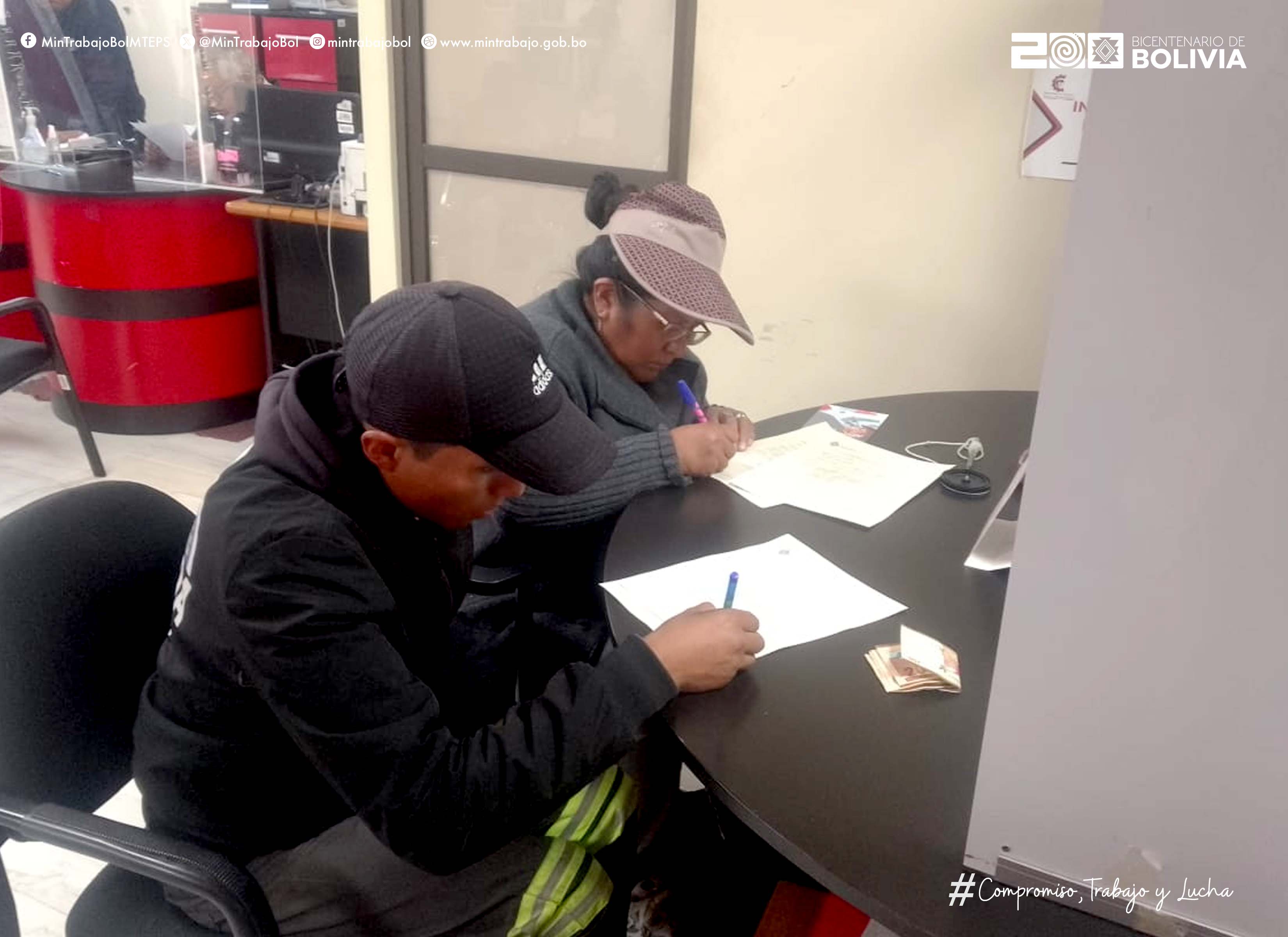 Ministerio de Trabajo, 30 de septiembre de 2025.- Dos trabajadores de profesión chofer se apersonaron, de manera independiente, a la Jefatura Regional de Trabajo de El Alto para solicitar la intervención en el cobro de sus beneficios sociales, tras la conclusión de su relación laboral con sus respectivos empleadores.