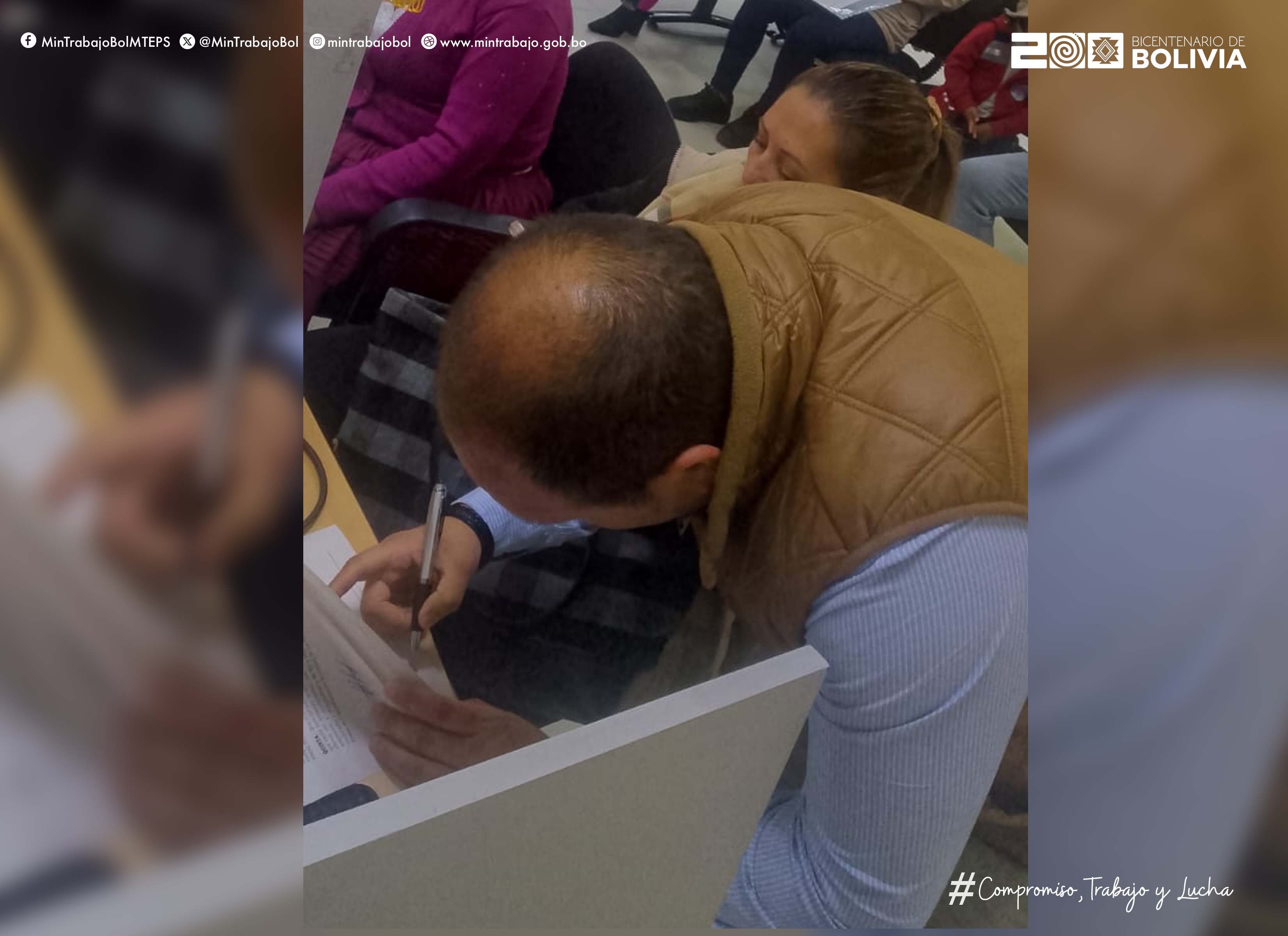 Ministerio de Trabajo, 8 de octubre de 2025.- Tras una audiencia de conciliación, una extrabajadora de la empresa de recojo de basura Trébol cobró sus beneficios sociales en la Jefatura Departamental de Trabajo de La Paz.