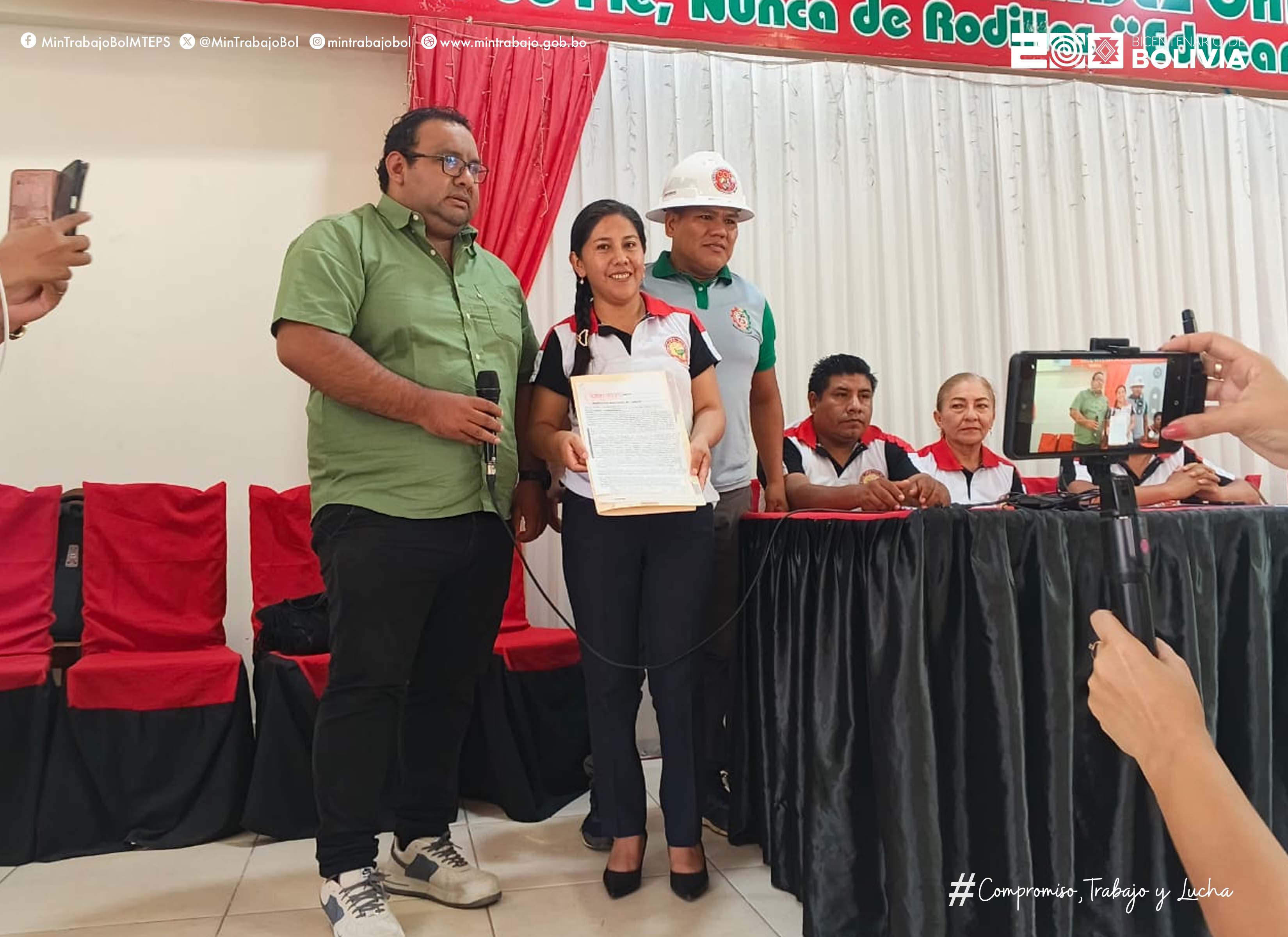 El Ministerio de Trabajo entrega resoluciones de reconocimiento a las directivas de organizaciones sindicales en Bolivia para validar y dar carácter legal a su existencia y a la representatividad de sus líderes, asegurando así que las directivas cumplen con los requisitos legales y tienen la autoridad para representar a los trabajadores ante empleadores y el Estado.