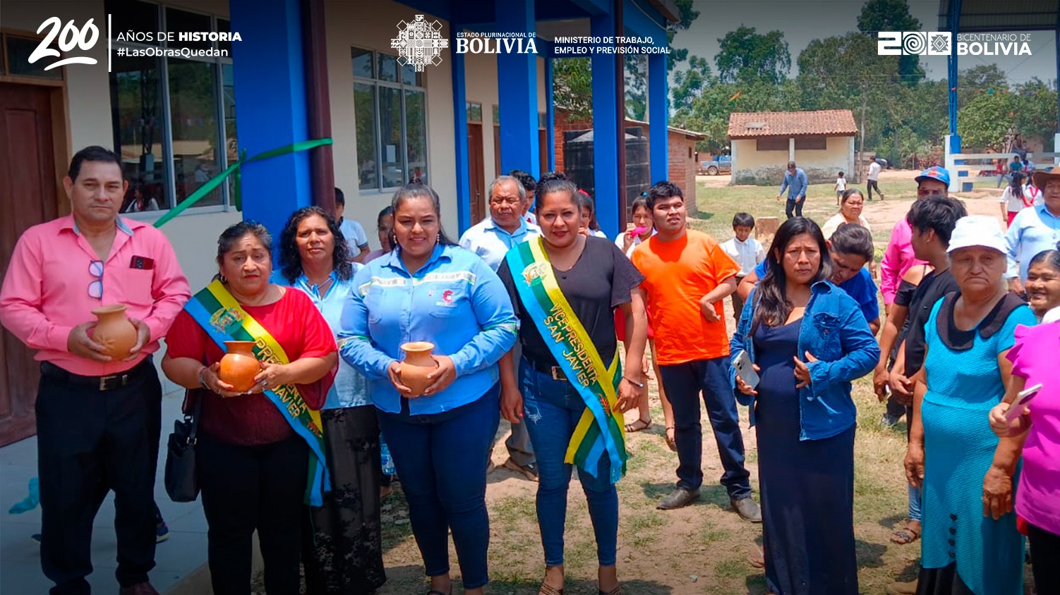 En nombre del presidente y en representación del Ministro de Trabajo, la Jefa Departamental de Trabajo en el departamento del Beni, Lucía Camama, hizo entrega de la construcción de la Unidad Educativa Reyes Alcocer, en la comunidad de Sacrificio, municipio de San Javier. “Hoy, en este año del Bicentenario, en un año de asedio político, hemos salido adelante fomentando la industrialización y manteniendo las subvenciones. El Gobierno Nacional siempre priorizó el bienestar de los bolivianos”, señaló. La infraestructura educativa demandó una inversión de Bs. 1.600.111,39, beneficiando a 8.000 habitantes.