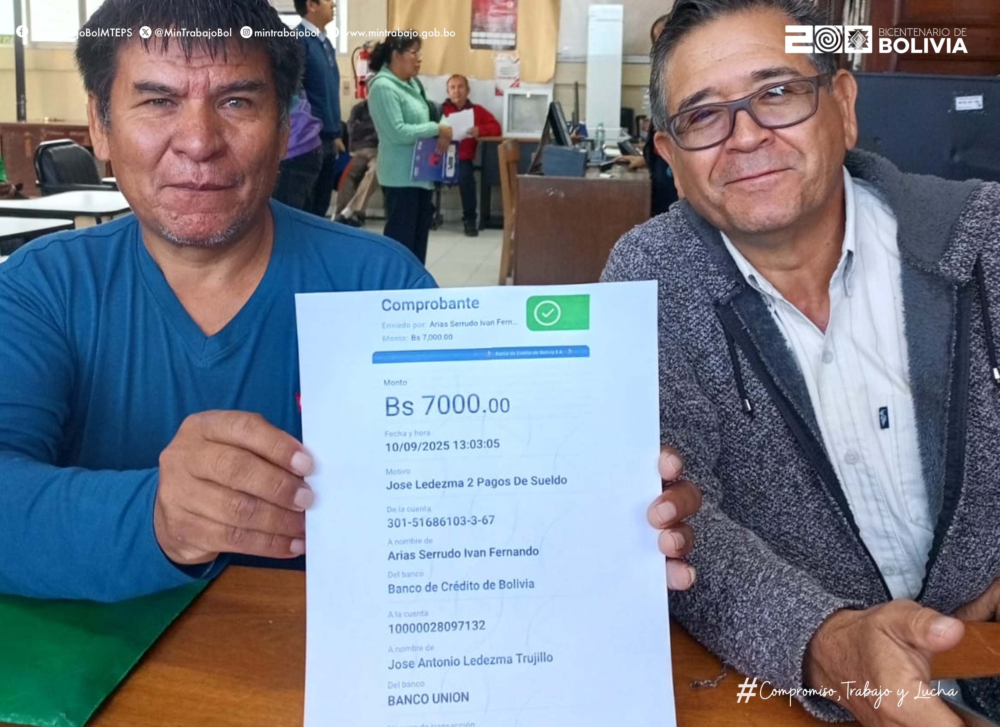 Con el último pago, se completó la totalidad de los beneficios sociales, que ascendían a Bs 17.500 (diecisiete mil quinientos 00/100 bolivianos).