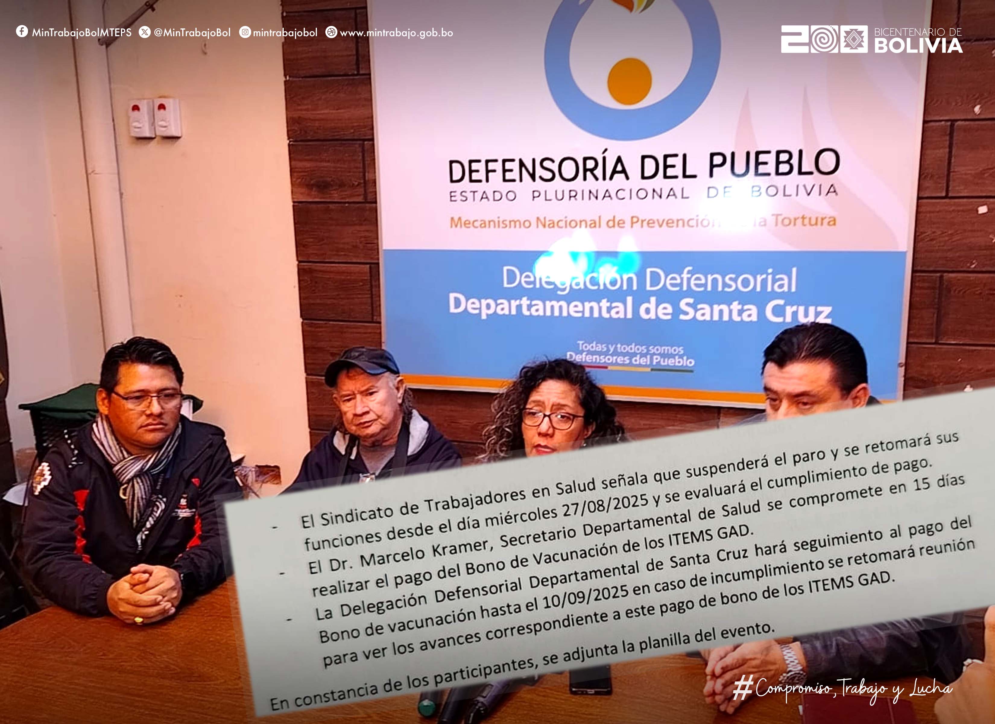 MINISTERIO DE TRABAJO Y OTRAS INSTITUCIONES LOGRAN LA SUSPENSIÓN DEL PARO DE TRABAJADORES DE SALUD EN SANTA CRUZ