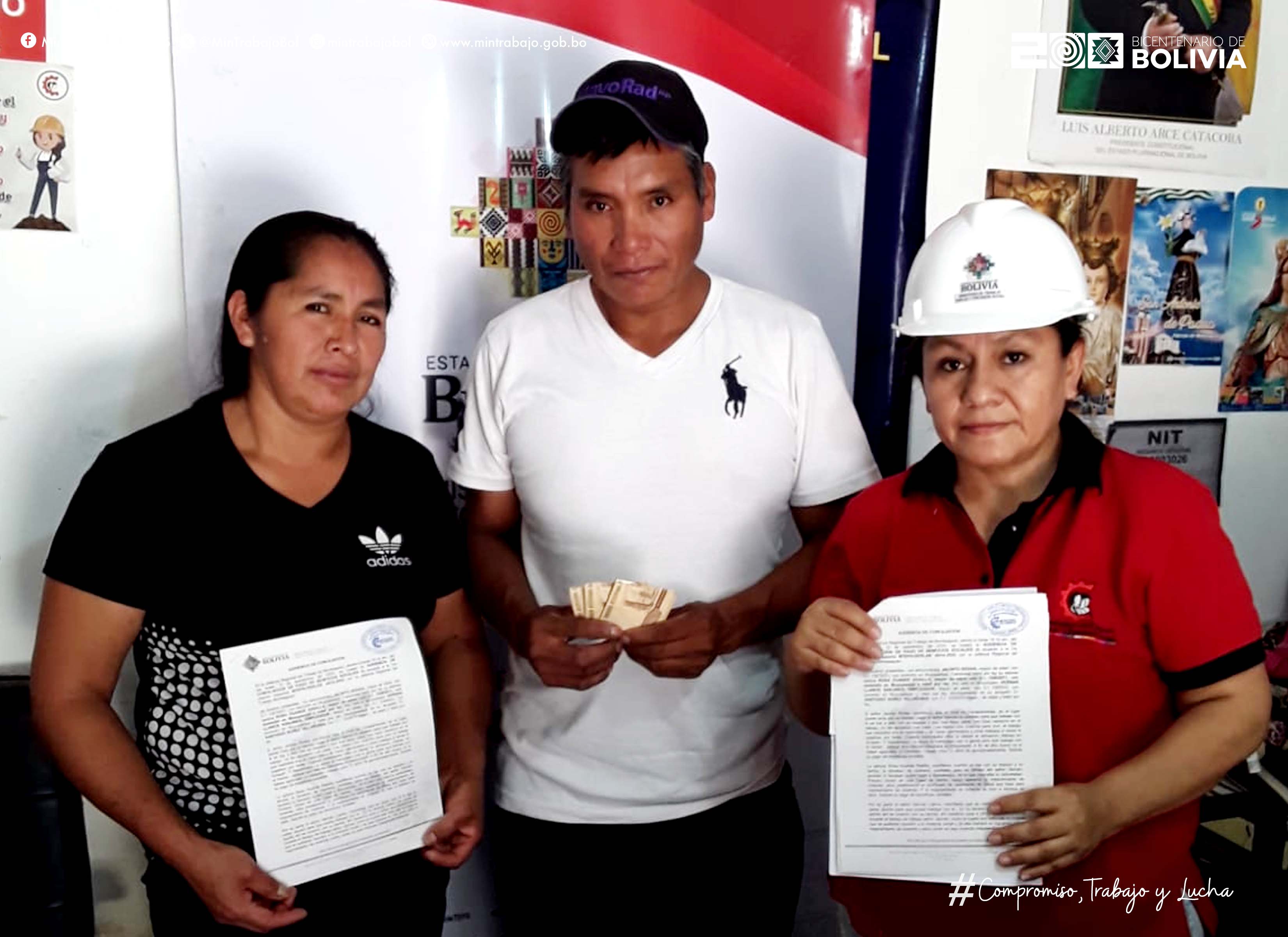 En audiencia de conciliación, se determinó que la pareja debía cobrar la suma de Bs 86.000 (ochenta y seis mil 00/100 bolivianos). Inicialmente, se les entregó en efectivo la suma de Bs. 6.000 (seis mil 00/100 bolivianos) y se propuso completar el pago con un terreno valuado en Bs 80.000 (ochenta mil bolivianos). Los denunciantes accedieron a esta propuesta, formalizándose así el pago de la indemnización y la restitución de sus derechos laborales.